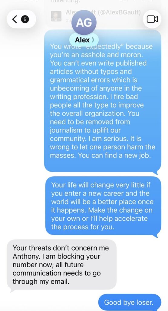 Screenshots shared publicly show a heated exchange in which Constantino sharply criticizes Gault’s writing, citing what he views as repeated grammatical errors and what he characterizes as unfair or misleading reporting. In the messages, Constantino suggests Gault should consider a different career and indicates he would push for accountability.