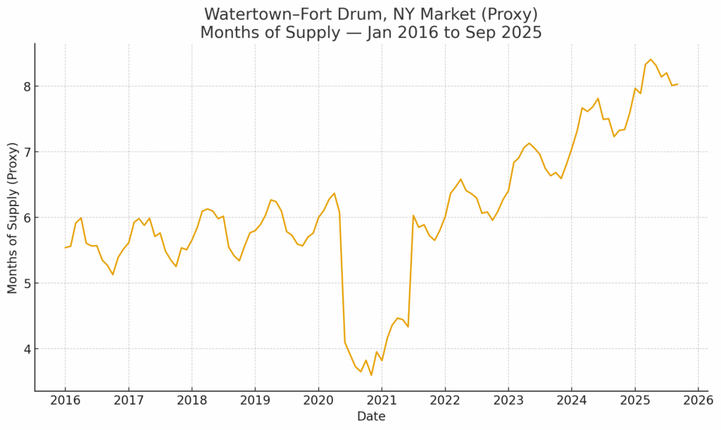A new analysis of inventory trends shows that “months of supply” — the measure of how long it would take for all current homes on the market to sell — has been steadily rising since late 2022 after hitting near-record lows during the pandemic buying frenzy. Back in 2020 and 2021, the market was so tight that homes were moving in three to four months. Today, Watertown–Fort Drum sits closer to seven or even eight months of supply — a level that is no longer a seller steamroll, but not quite a buyer’s paradise either.